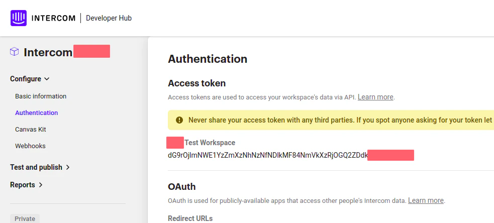 - Intercom Access token: Copied earlier from the Intercom Developer Hub.
