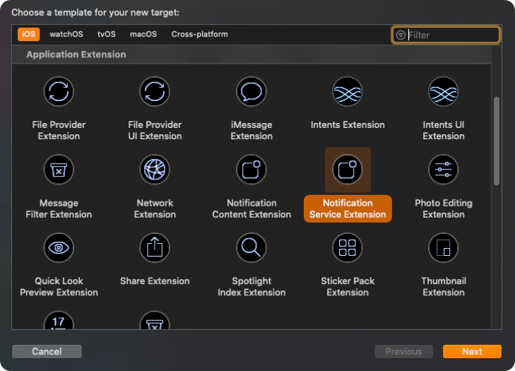 1. Click on File —> New —> Targets —> Application Extension —> Notification Service Extension.