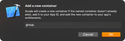 1. In App Groups, click on [+] —> Add a new container —> Enter group name —> OK.