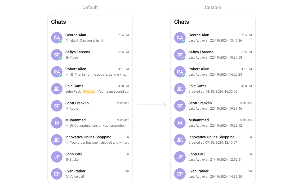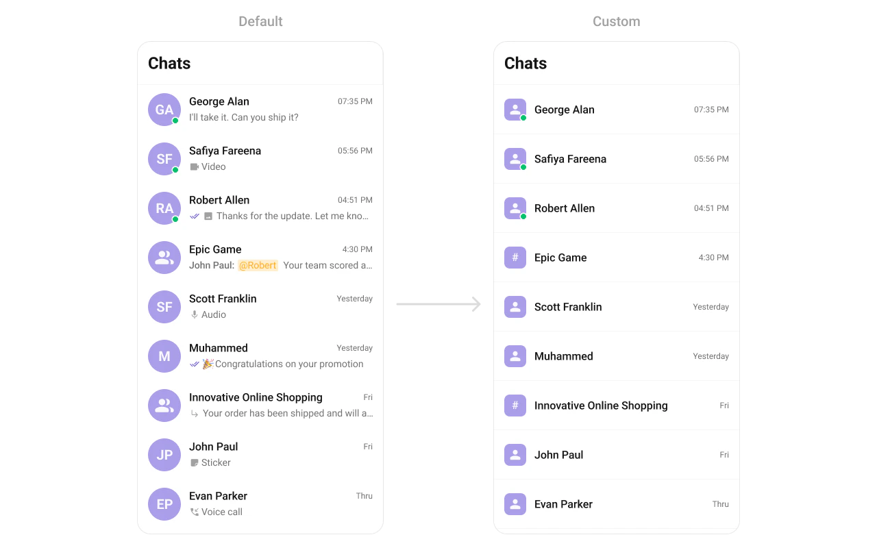 | Trailing view | setTrailingView(ConversationsViewHolderListener) | Timestamp / badge / right section |