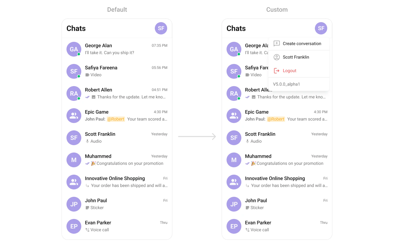 What this does: Replaces the default item-click behavior. When a user taps a conversation, your custom lambda executes instead of the built-in navigation.