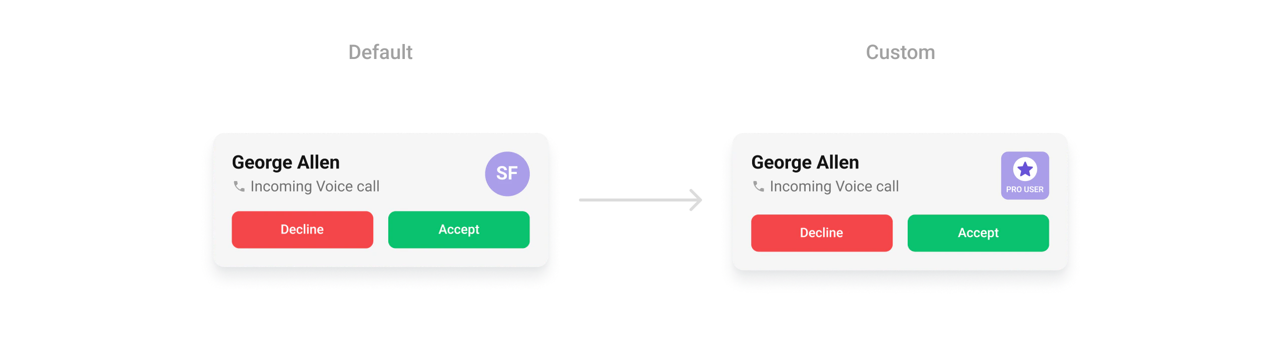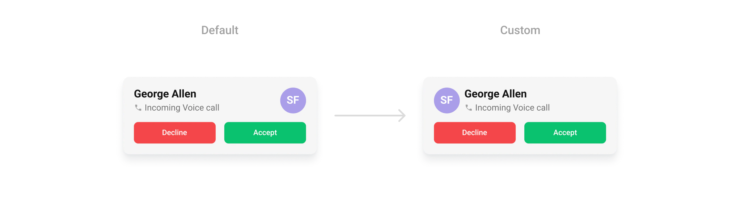 • Verify: The incoming call screen displays with a purple background (#AA9EE8), custom button colors, and avatars with rounded corners (8dp radius) and an orange background (#FBAA75).