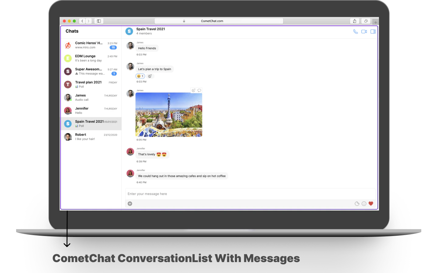 TheCometChatConversationListWithMessages is a component with a list of recent conversations. The component has all the necessary listeners and methods required to display the recent conversation list and shows the set of the messages/chats of the selected recent conversation