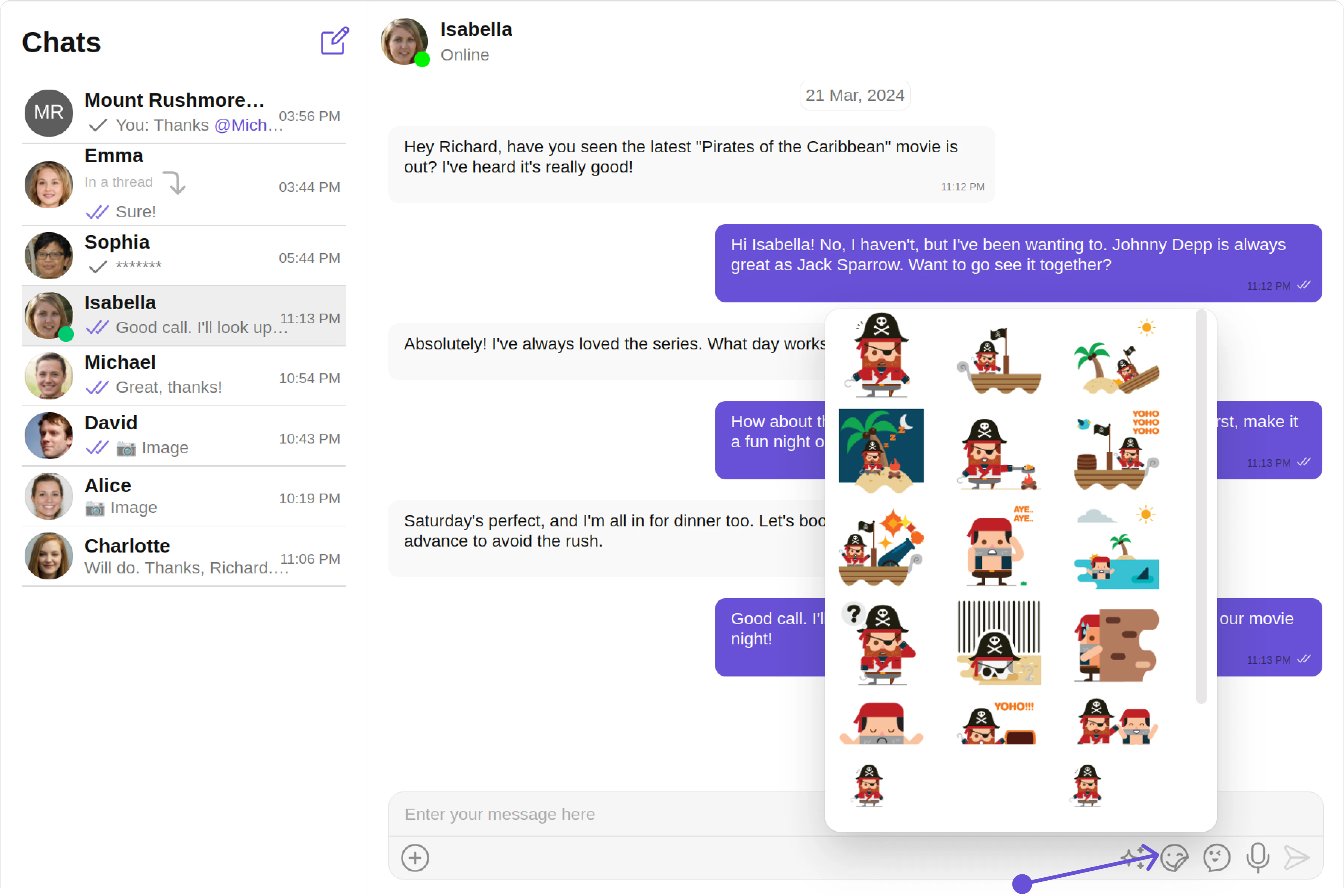 The Stickers extension allows users to express their emotions more creatively. It adds a much-needed fun element to the chat by allowing users to send various pre-designed stickers. For a comprehensive understanding and guide on implementing and using the Sticker Extension, refer to our specific guide on the Sticker Extension. Once you have successfully activated the Sticker Extension from your CometChat Dashboard, the feature will automatically be incorporated into the Message Composer component of UI Kits.