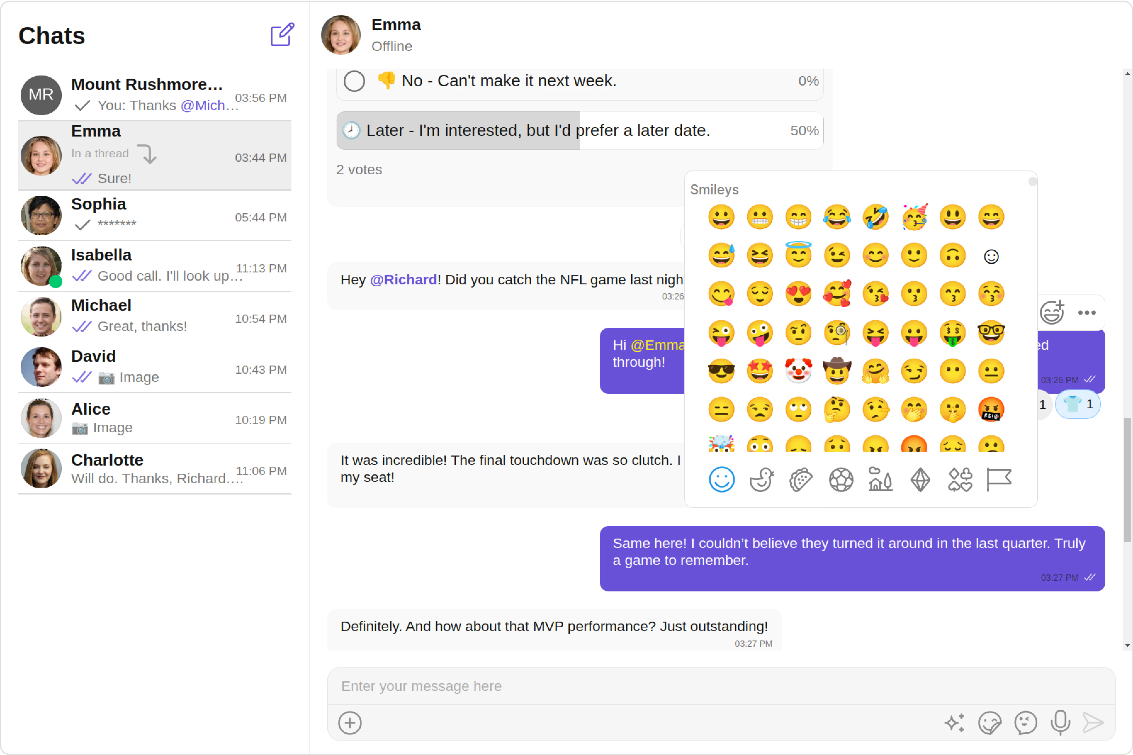 Smart Replies extension provides automated, predictive text responses, making the conversation more efficient by reducing the response time. For a comprehensive understanding and guide on implementing and using the Smart Replies Extension, refer to our specific guide on the Smart Replies Extension.