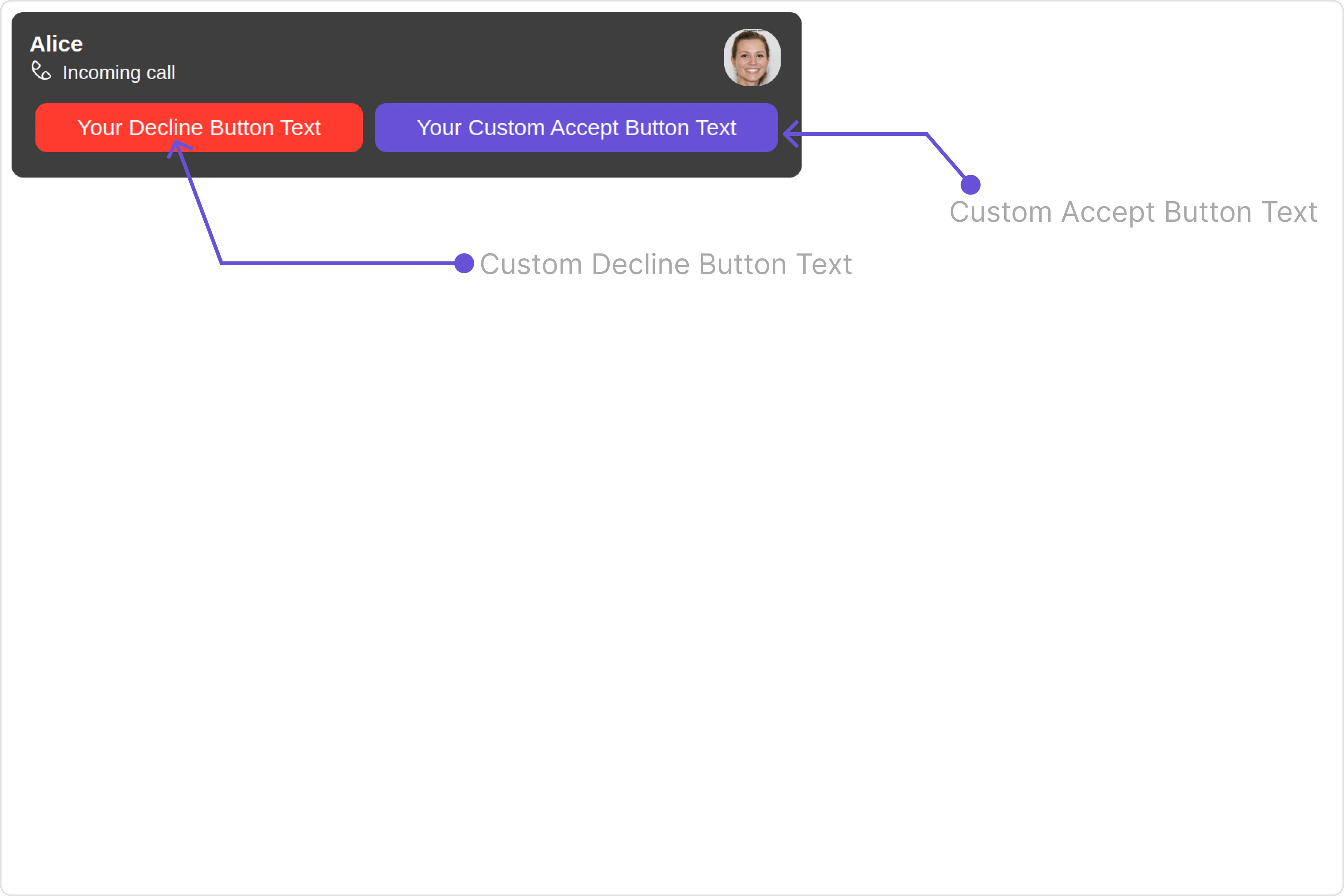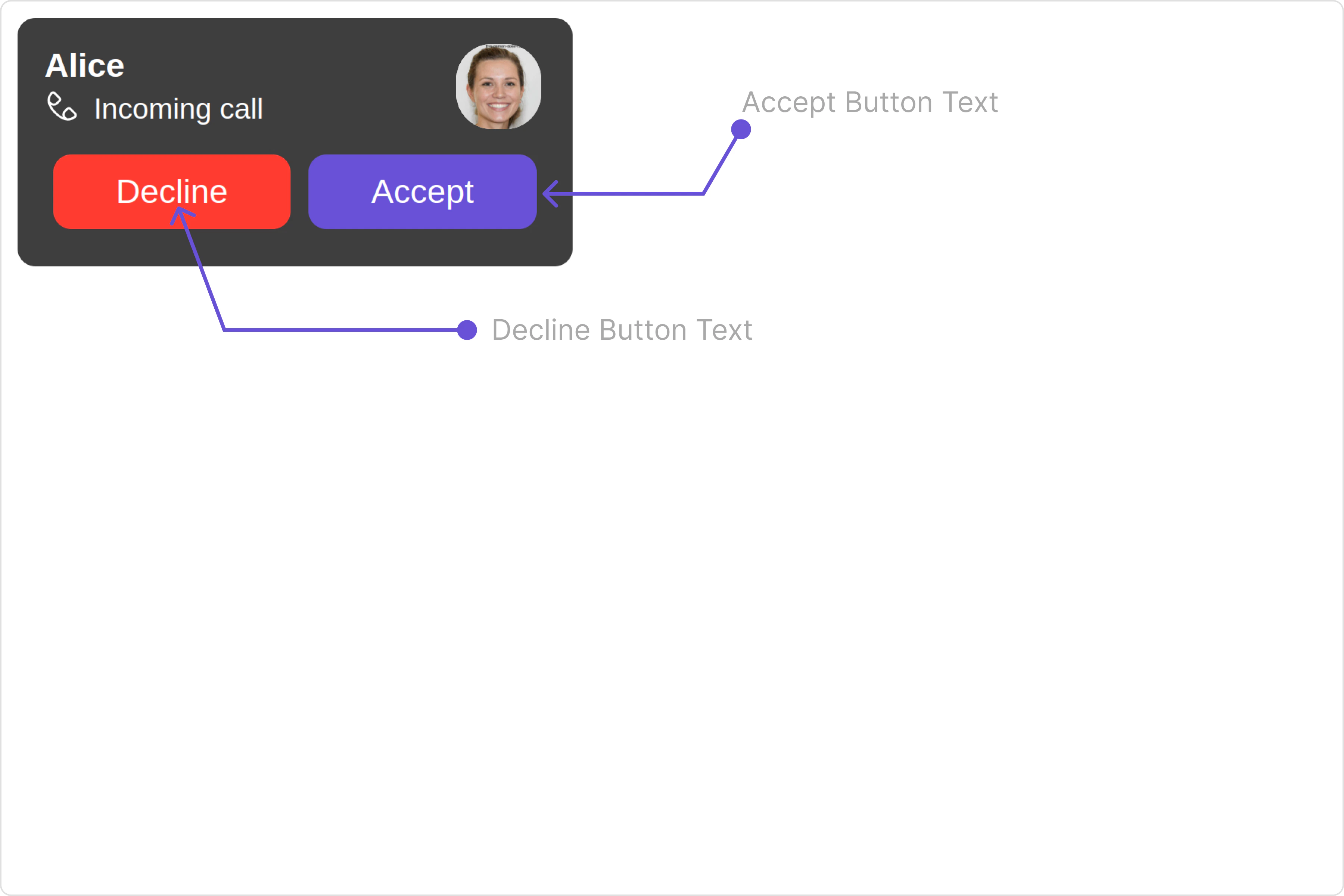 These are a set of small functional customizations that allow you to fine-tune the overall experience of the component. With these, you can change text, set custom icons, and toggle the visibility of UI elements. Here is a code snippet demonstrating how you can customize the functionality of the Incoming Call component.