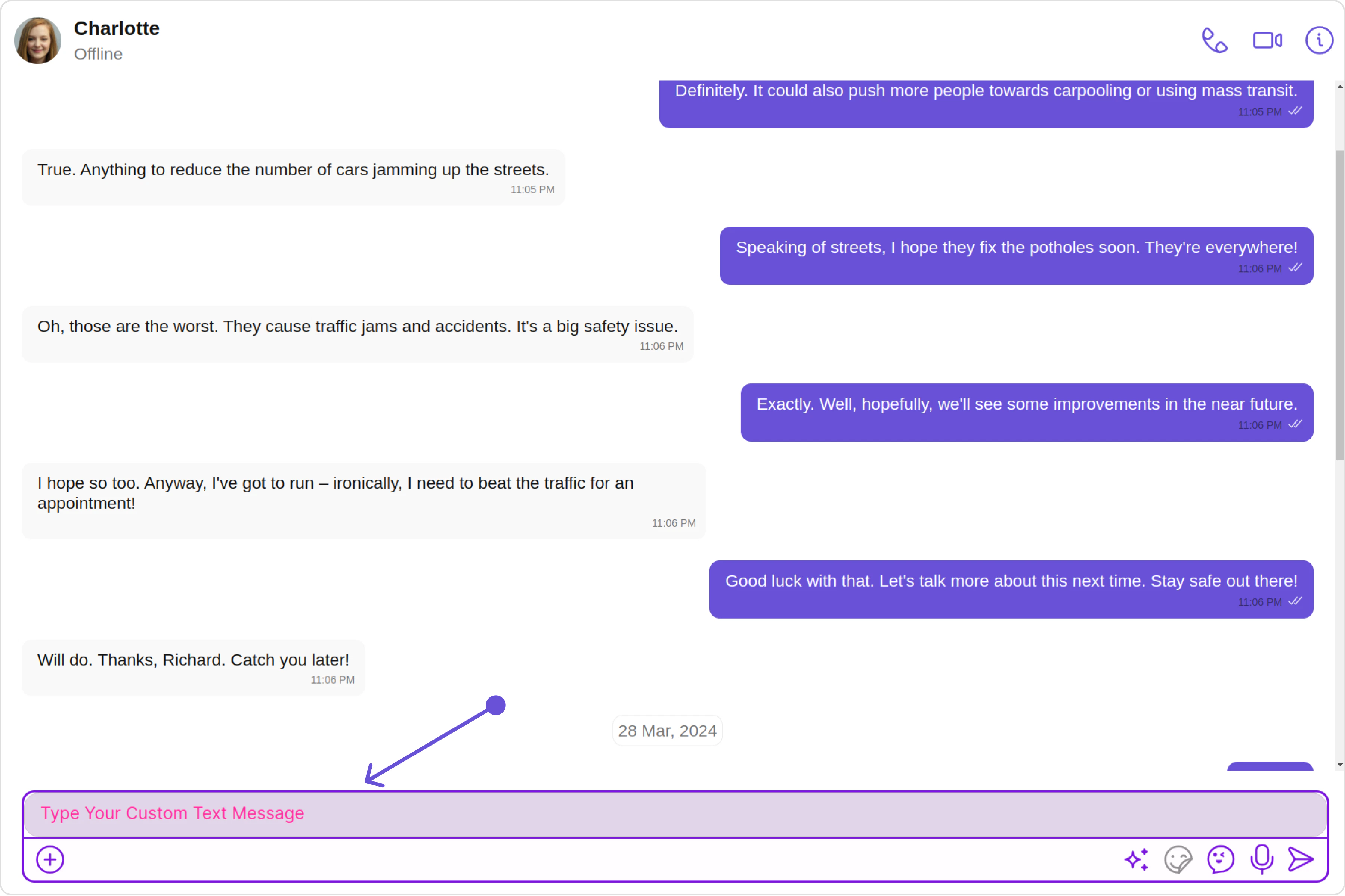 In this example, we’ll be adding styling to the message composer and custom text to the MessageComposer component using MessageComposerConfiguration.