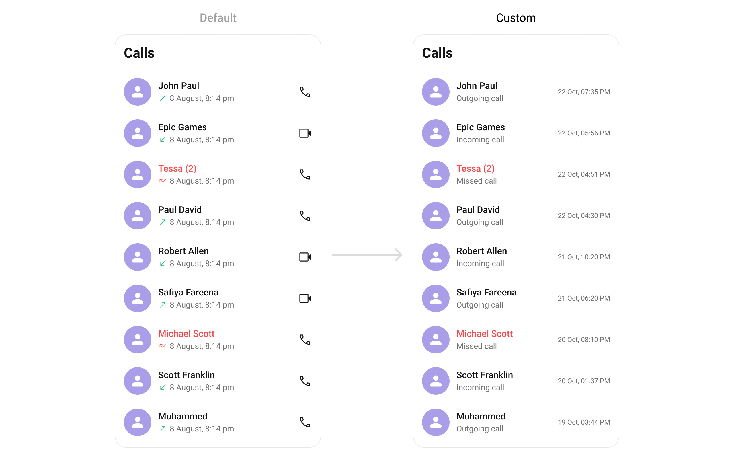You can customize the subtitle widget for each call logs item to meet your requirements Example Here is the complete example for reference:- Dart