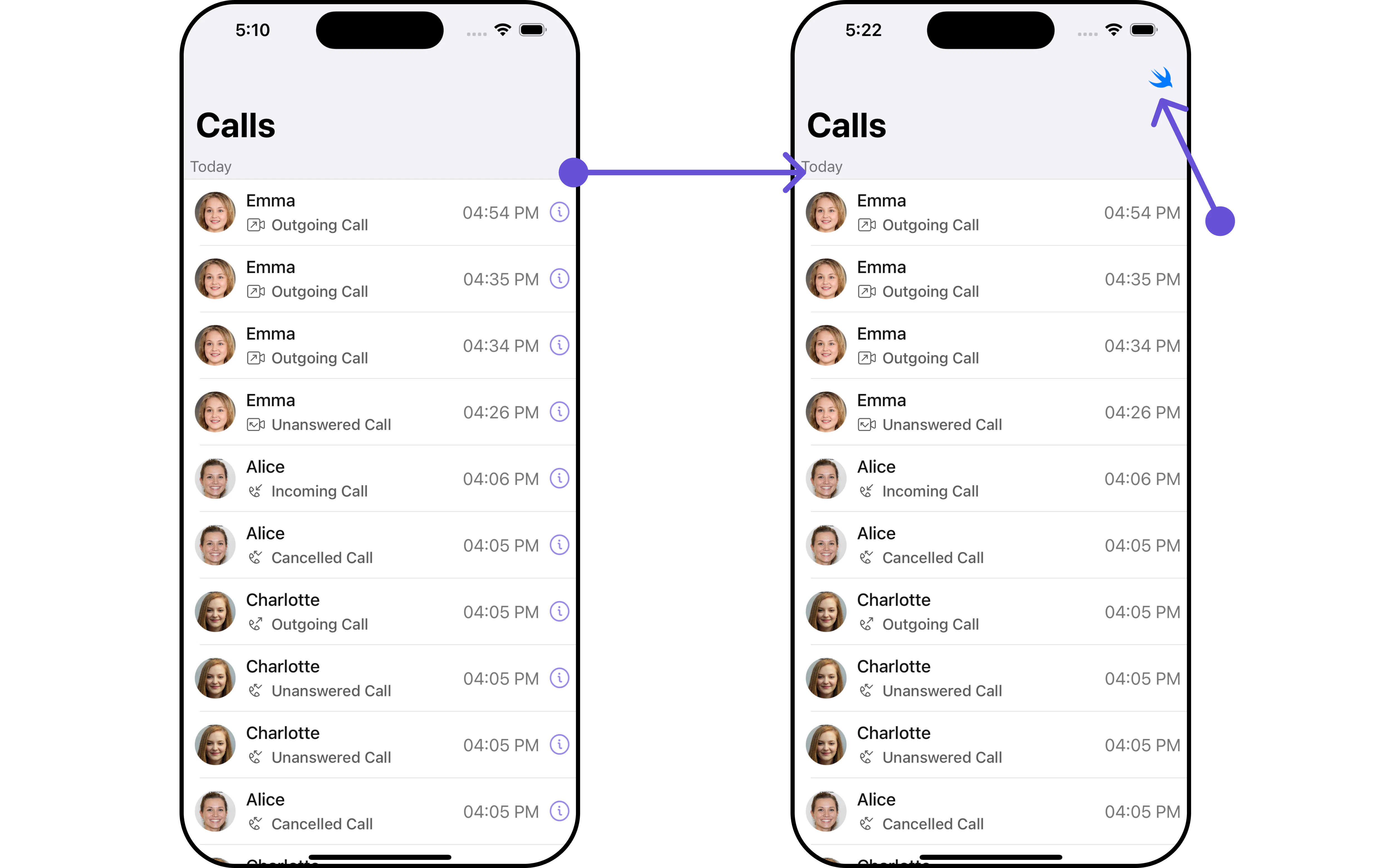 CometChatCallLogs. If a navigation controller is already in use, utilize the pushViewController function instead of directly presenting the view controller.Functionality