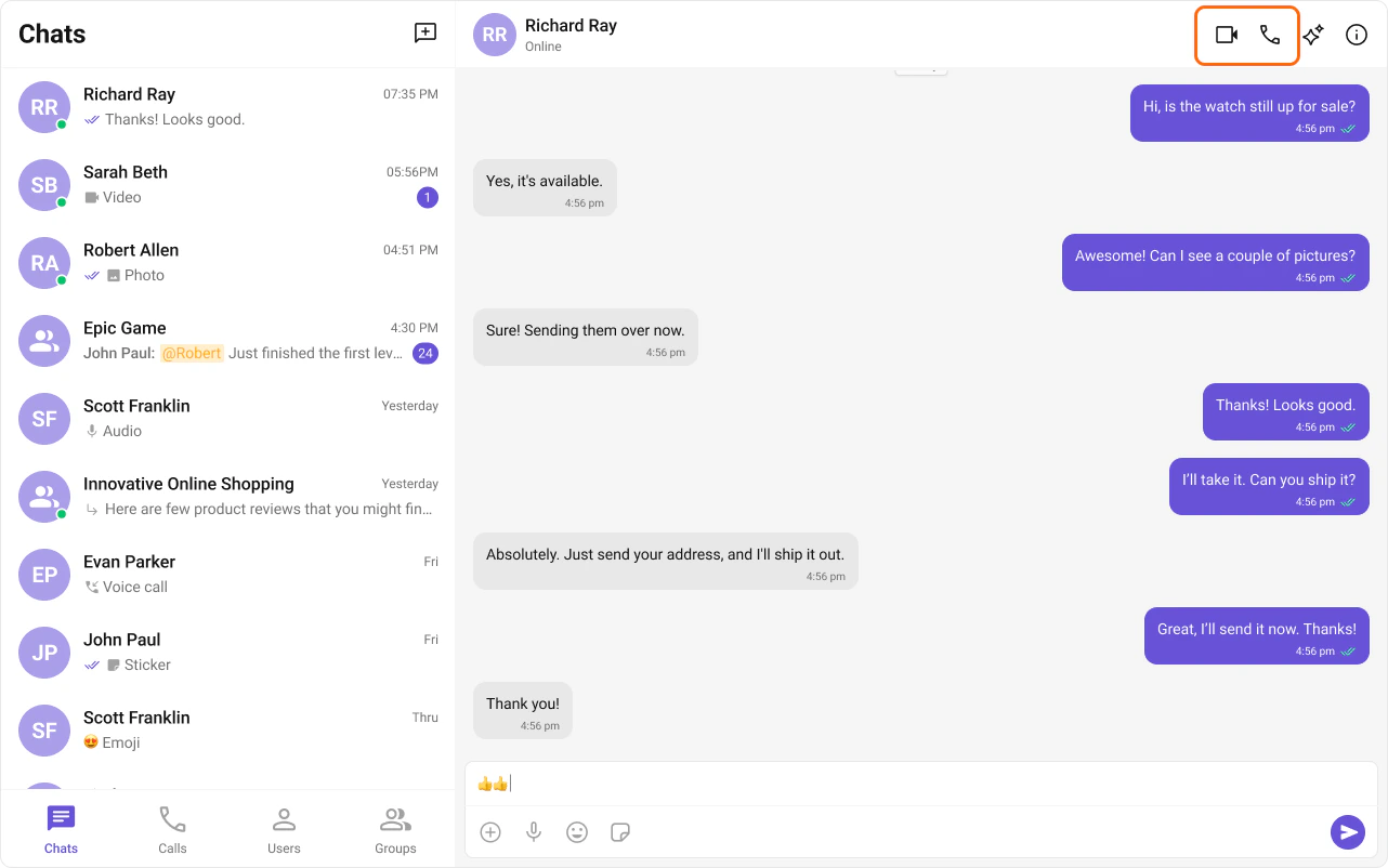 After adding the dependency, the React UI Kit will automatically detect it and activate calling features. You will see CallButtons rendered in the MessageHeader component.
