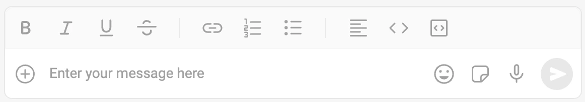 | enableRichTextEditor | boolean | false | Master switch to enable rich text formatting. When false, the composer works as plain text only. | enableRichTextEditor={true} |