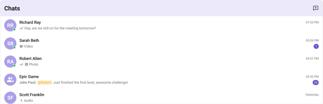 onTextMessageReceived / onMediaMessageReceived / onCustomMessageReceived | Moves conversation to top, updates last message preview and unread count |