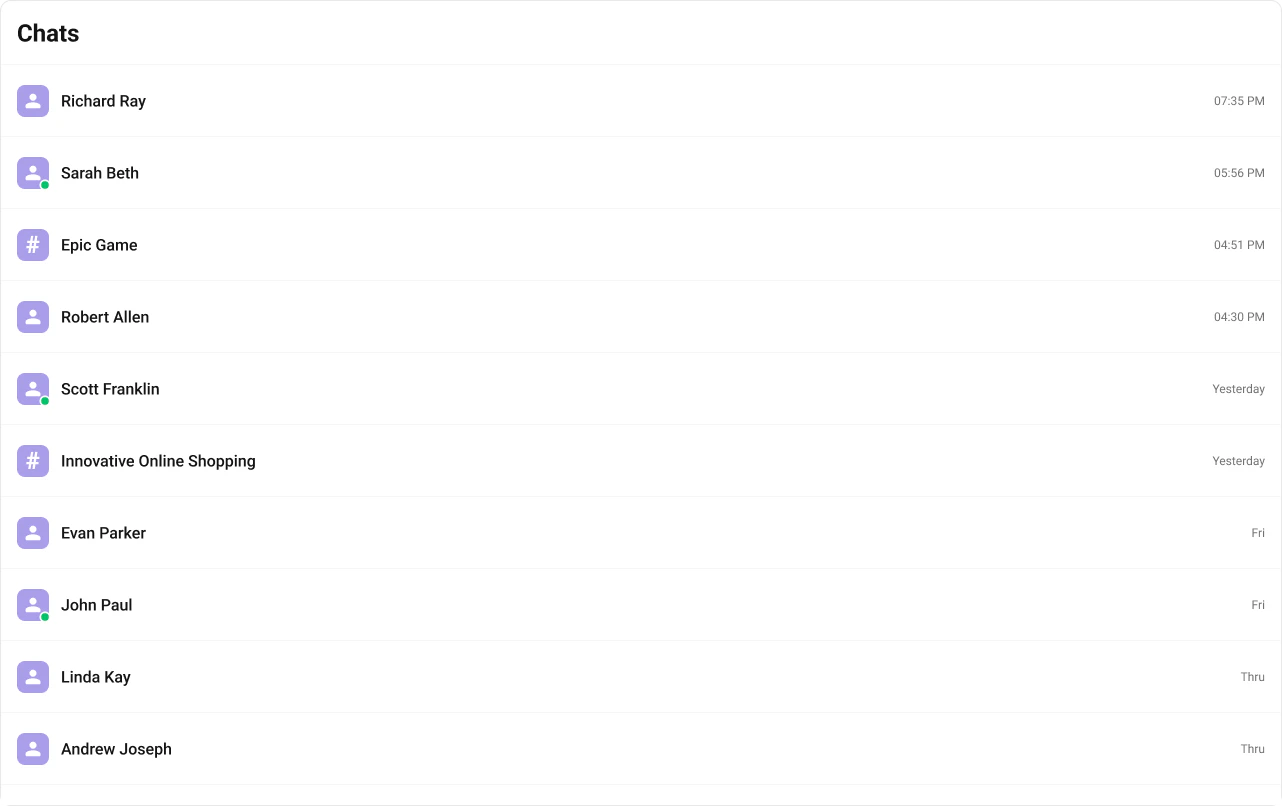 onUserOnline / onUserOffline | Updates online/offline status dot (unless hideUserStatus={true}) |