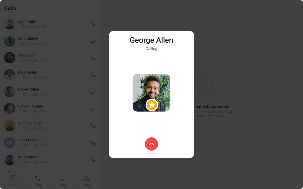 CometChatOutgoingCall is an overlay component that displays the outgoing call screen with the recipient’s name, avatar, and a cancel button. It plays a ringtone while the call is pending. Typically rendered at the app root level after initiating a call via CometChat.initiateCall().