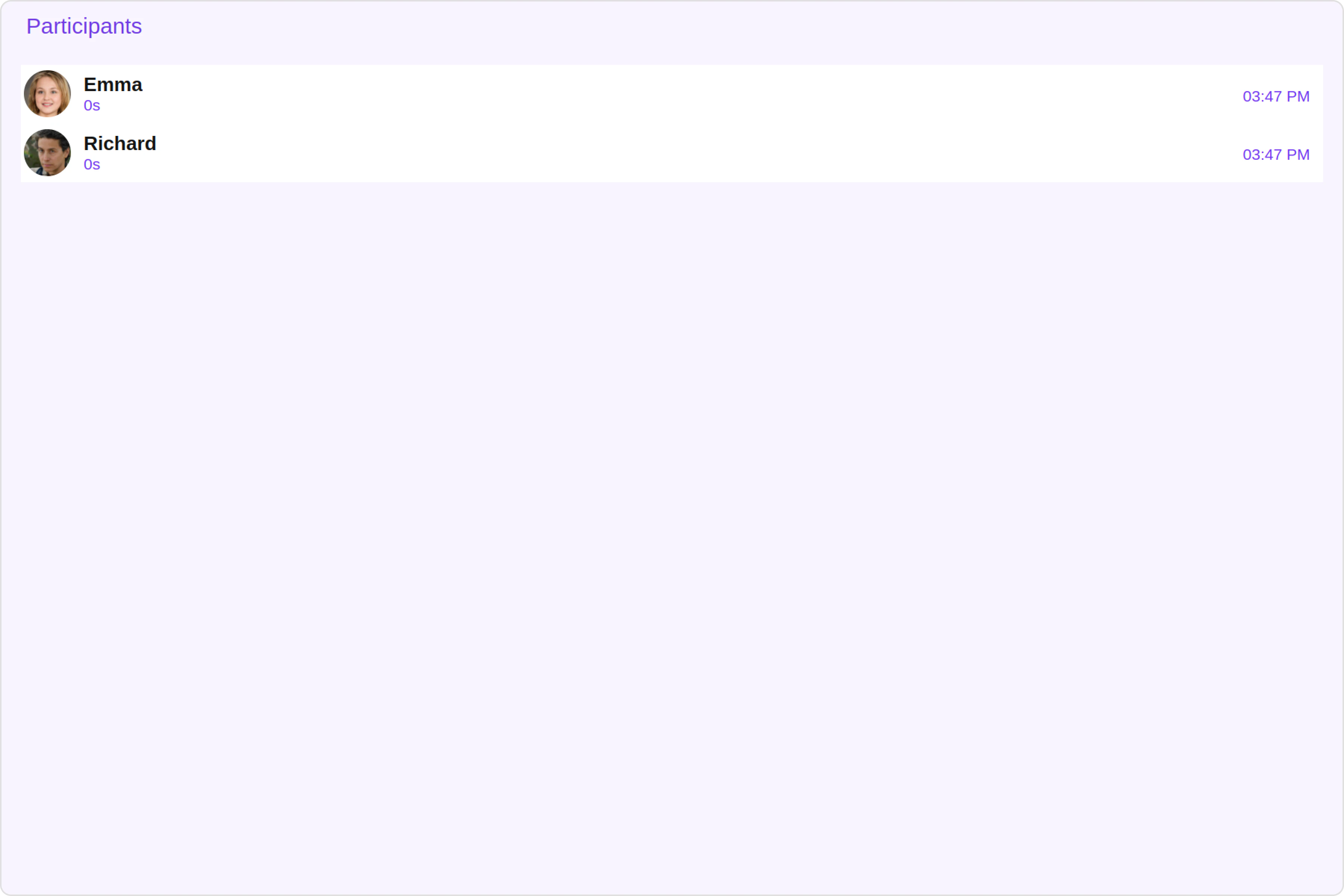 To fit your app’s design requirements, you have the ability to customize the appearance of the CallLogParticipants component. We provide exposed methods that allow you to modify the experience and behavior according to your specific needs.